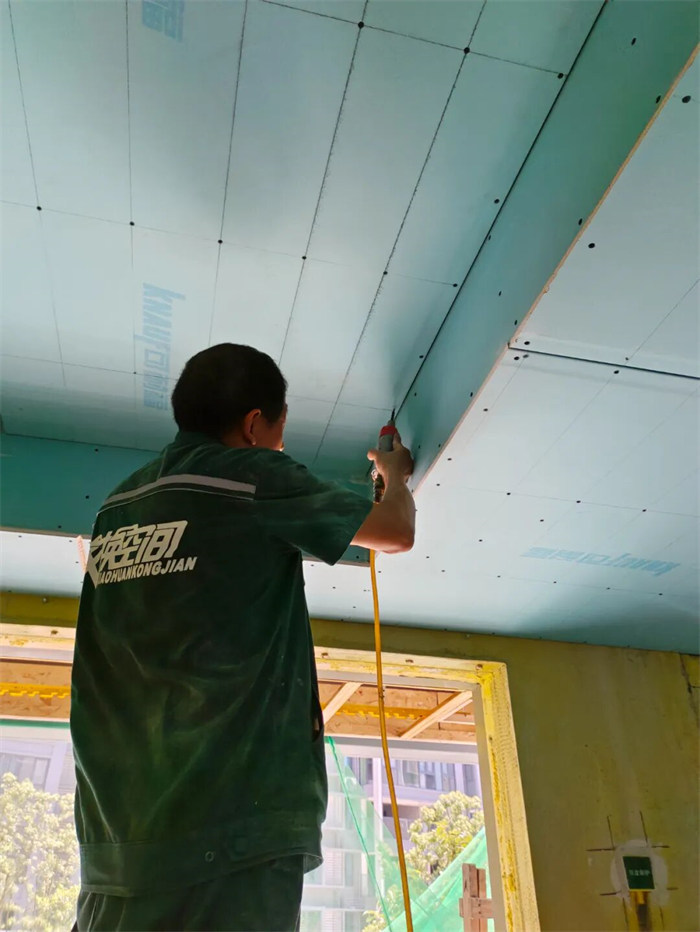 △師傅正手持電鉆固定板材,板材拼接處,縫隙控制得極為精準(zhǔn),每顆釘子的間距都有嚴(yán)格標(biāo)準(zhǔn)
