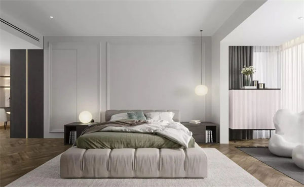 設(shè)計(jì)建議:將臥室空調(diào)安裝床尾側(cè)方的墻面上,這樣空調(diào)風(fēng)會從側(cè)面或者通過室內(nèi)立面的反彈轉(zhuǎn)吹到床上,整體的風(fēng)力比較舒適柔和。